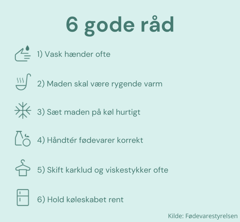 Fælles for dem er, at de kan give en ordentlig omgang ondt i maven, hvis du kommer i kontakt med dem gennem den mad, du spiser. De sidder ofte i råt kød, men også i fisk, skaldyr og grøntsager. Der er heldigvis en masse, du selv kan gøre for at mindske risikoen for nærkontakt med de skadelige bakterier og vira. Her får du 6 af de bedste råd om køkkenhygiejne fra Fødevarestyrelsen.