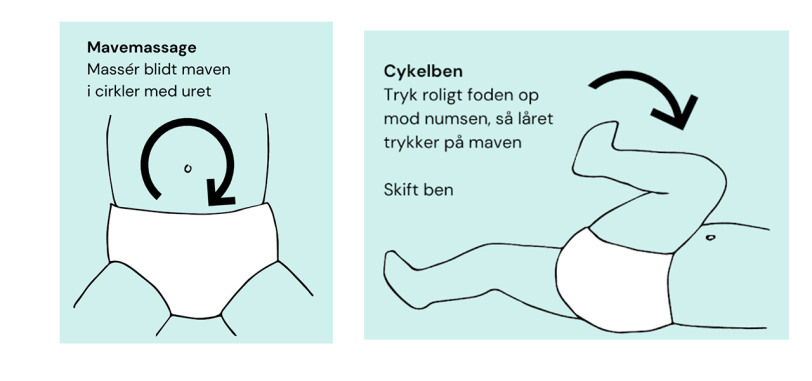 Du kan forsøge at afhjælpe dit barns gener med blid mavemassage og -gymnastik, som sætter gang i tarmens bevægelser, så barnet kan komme af med luft i maven.