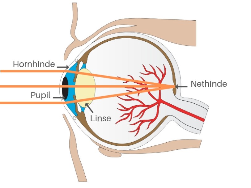 Langsynet: Øjet er for kort, når man måler fra hornhinde til nethinde. Derfor bliver billedet, der dannes af hornhinden og øjets linse, sendt for langt bagud til at stå skarpt på nethinden.
