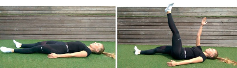 Løft højre arm og venstre ben mod loftet (benet må gerne være let bukket)