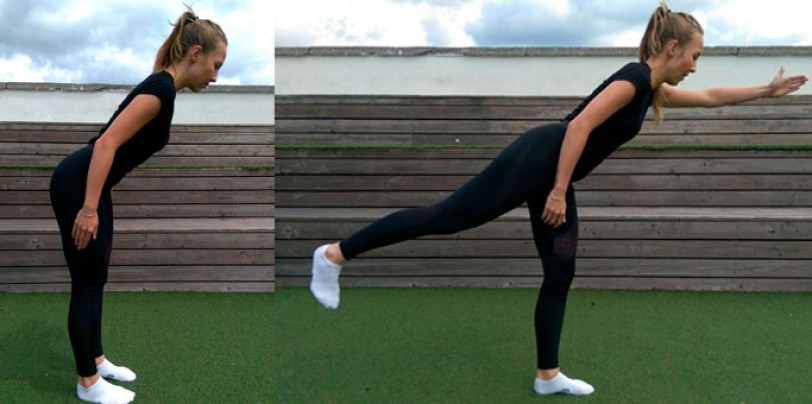 Lad venstre arm gå frem og op, samtidig med at højre ben føres strakt bagud