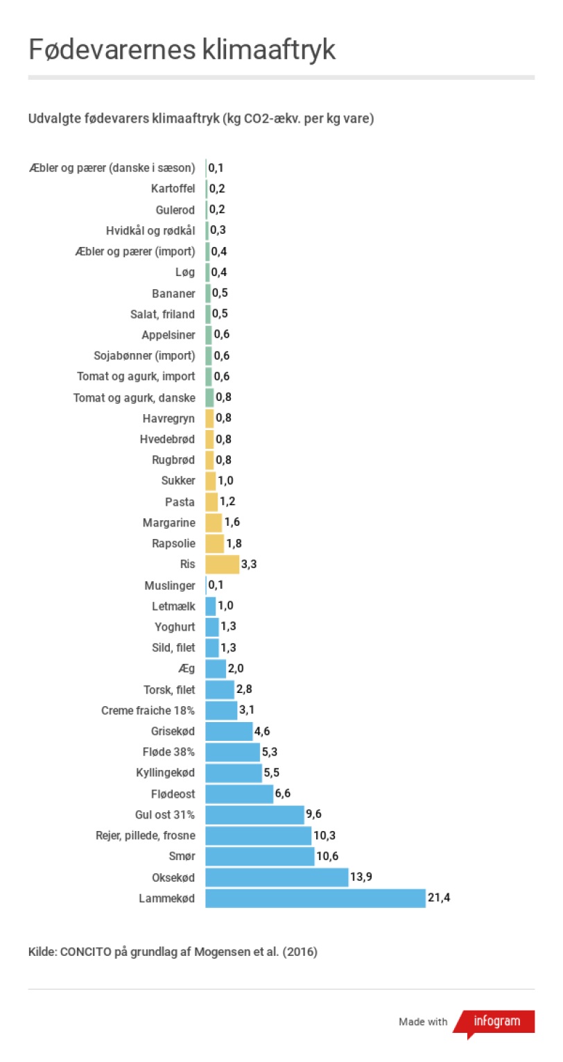 Af de tre tons drivhusgasser, hver dansker i gennemsnit udleder, kommer op imod 75 % af drivhusgasserne fra vores forbrug af kød og mejerivarer. Den største enkeltstående klimabelastning kommer fra produktionen af oksekød, der i Danmark står for op til 1,5 tons CO2 og andre drivhusgasser om året. Herefter kommer ost og mælk på hver knap 0,5 tons CO2 årligt. Den laveste klimabelastning kommer fra de vegetabilske fødevarer, hvor produkter baseret på gryn og korn som for eksempel havregryn og brød ligger i bund. Kartofler er også meget klimavenlige.