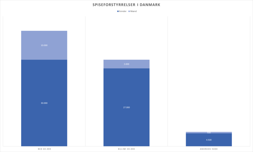 Det vurderes, at der i Danmark er 40.000-50.000 personer, der lider af BED, hvilket er flere end anoreksi og bulimi tilsammen.
