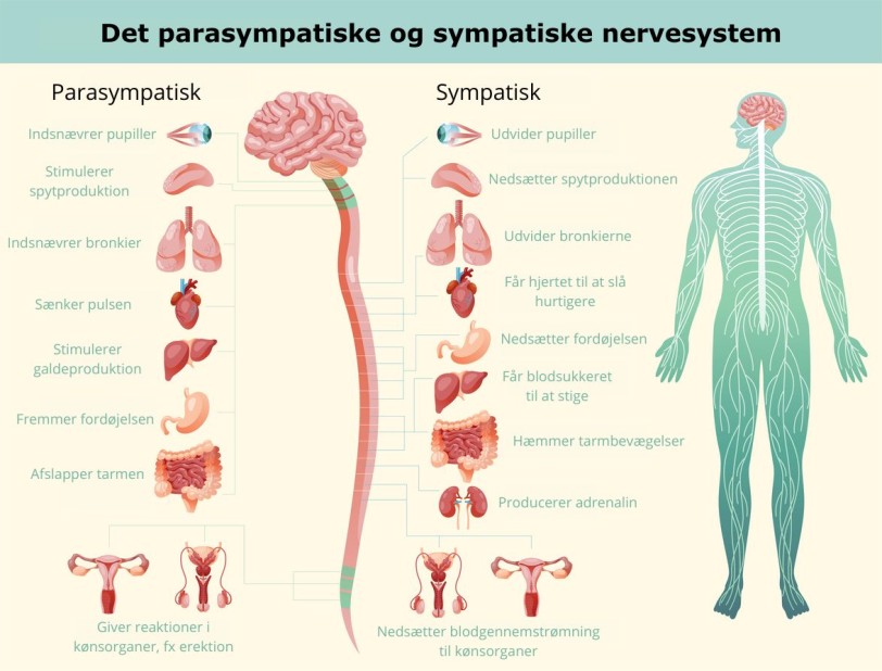 Det autonome nervesystem er inddelt i det sympatiske nervesystem og det parasympatiske nervesystem.